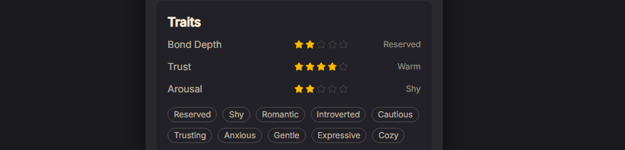 Added Arousal Level metric to companion profiles - now you can see your companion's responsiveness with a 5-star rating and descriptive labels ranging from "Very Shy" to "Very Responsive"